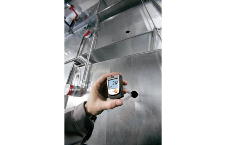 Con el anemómetro térmico testo 405 medirá la velocidad del aire, el caudal volumétrico y la temperatura ambiente. Es adecuado para mediciones de control rápidas en los conductos de ventilación y para la medición de la velocidad del aire en zonas como ven