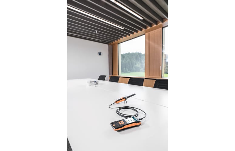 Con la sonda se comprueban las condiciones ambientales, por ejemplo, en oficinas, salas de producción o almacenes. Para garantizar resultados precisos de medición se ejecuta una compensación de la densidad del aire mediante la medición de presión absoluta integrada.