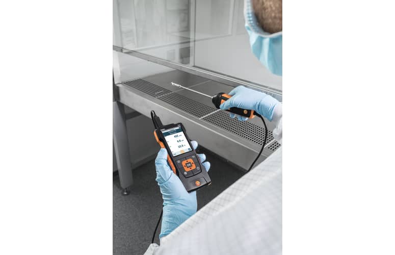 Para mediciones en la campana de flujo laminar: con esta sonda se miden la velocidad, el caudal volumétrico y la temperatura del aire en las campanas de los laboratorios.